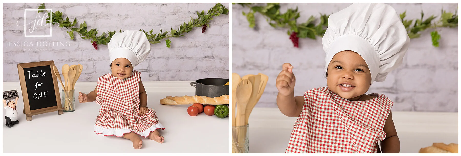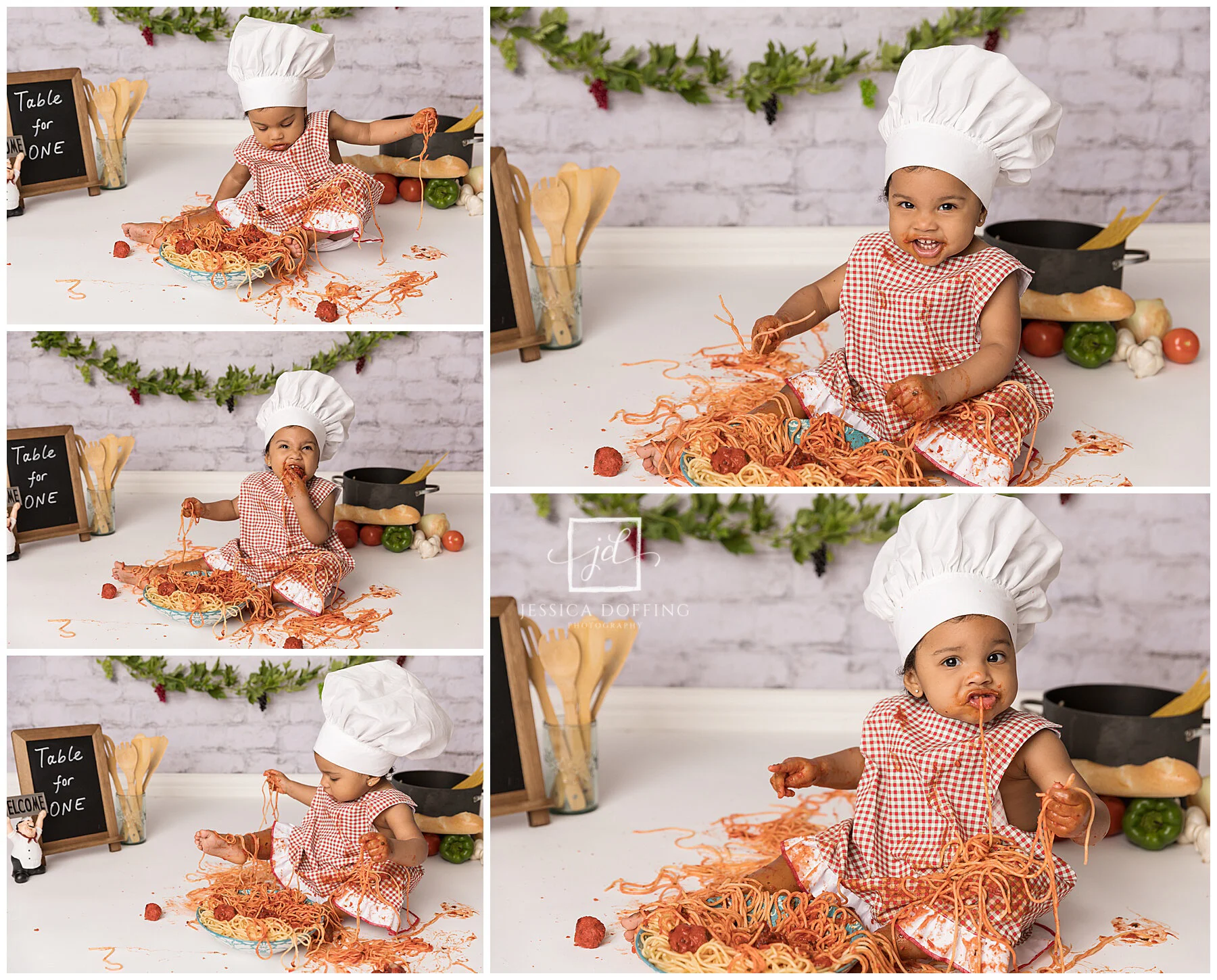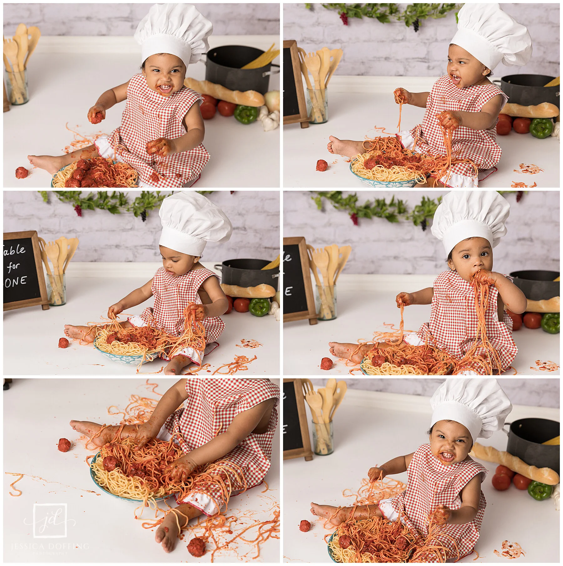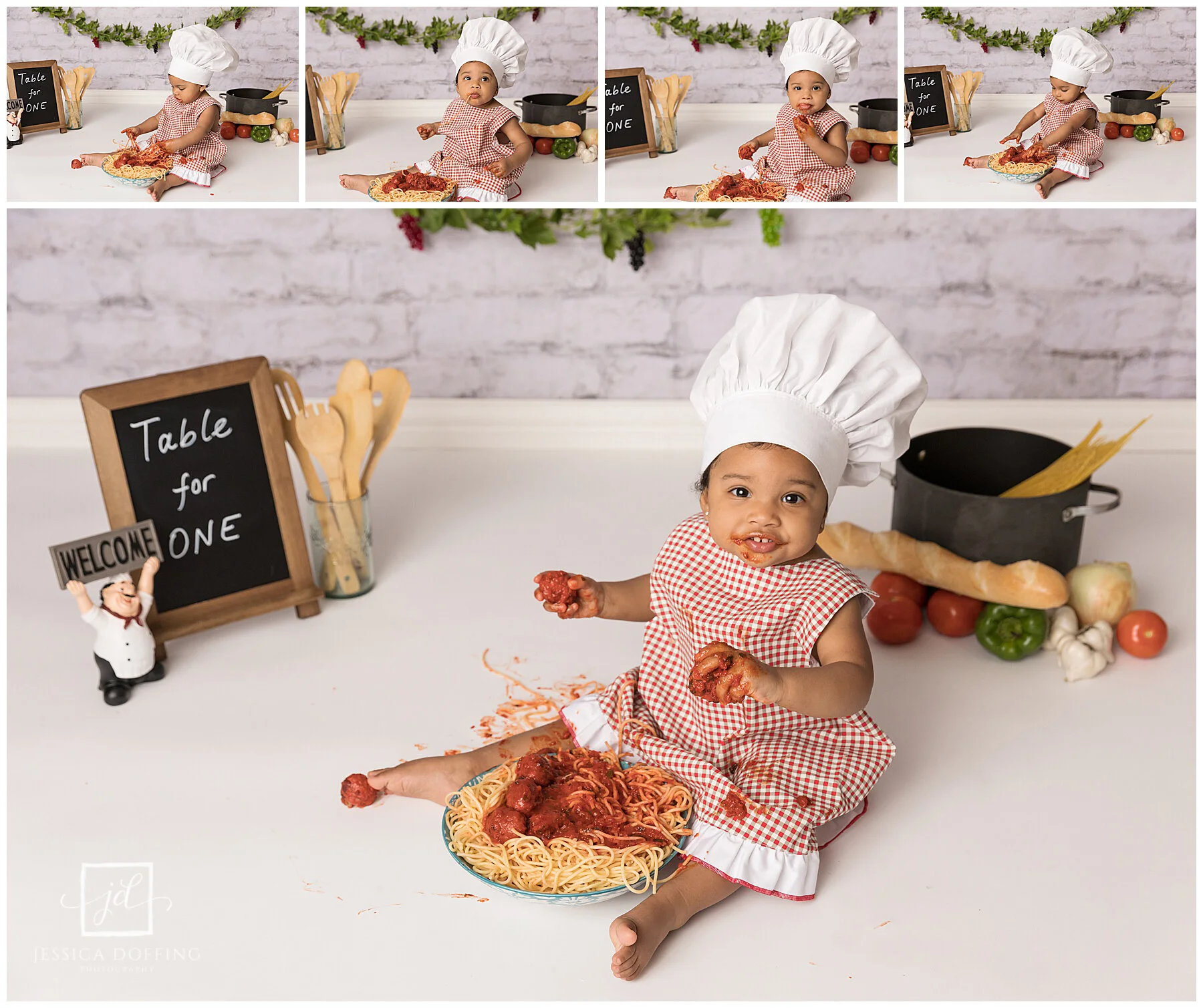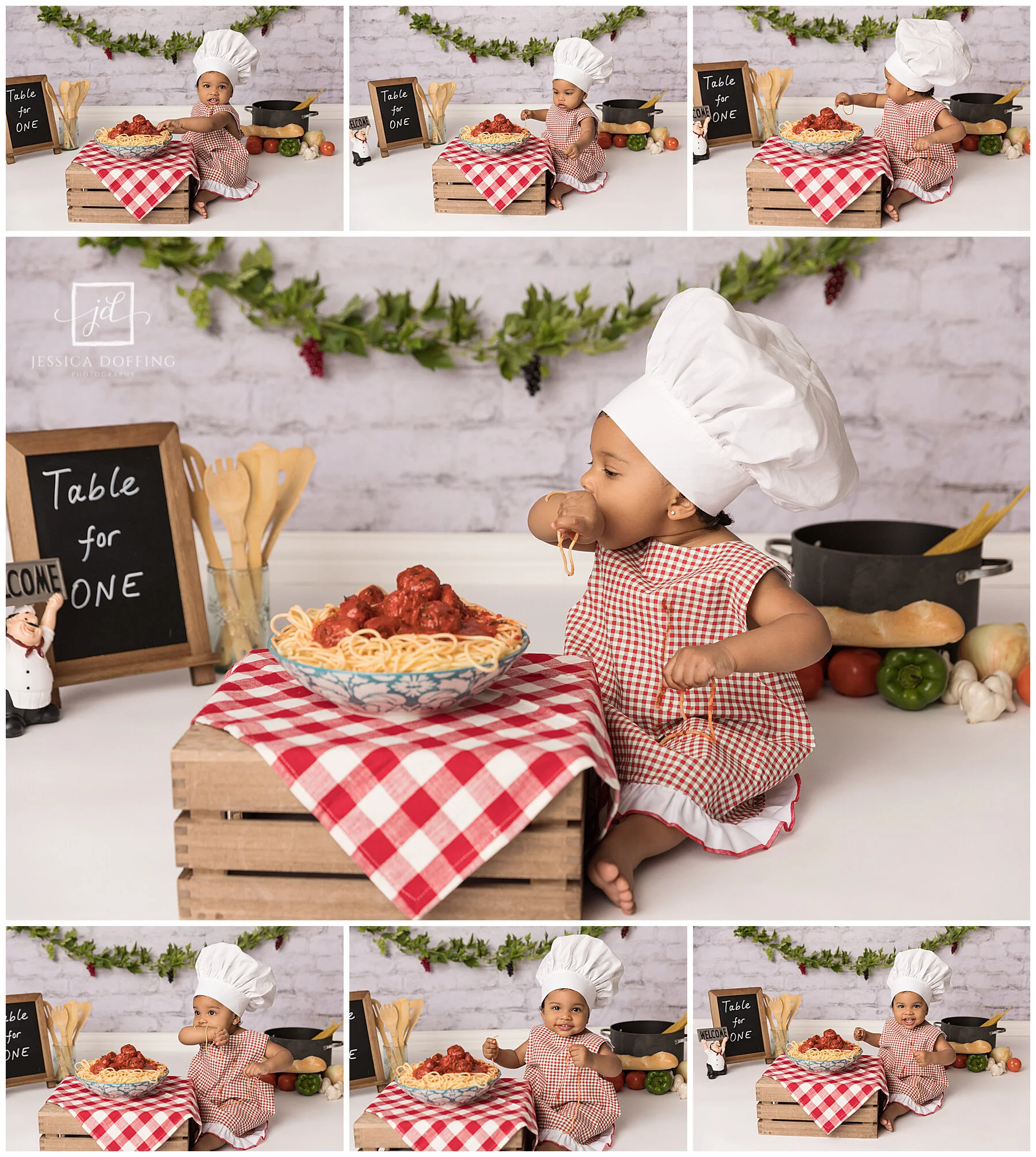 I didn’t want the set to be too distracting so I just used a few Italian-inspired props and some colorful spaghetti ingredients. I found the cute little apron and chef’s hat on Etsy.